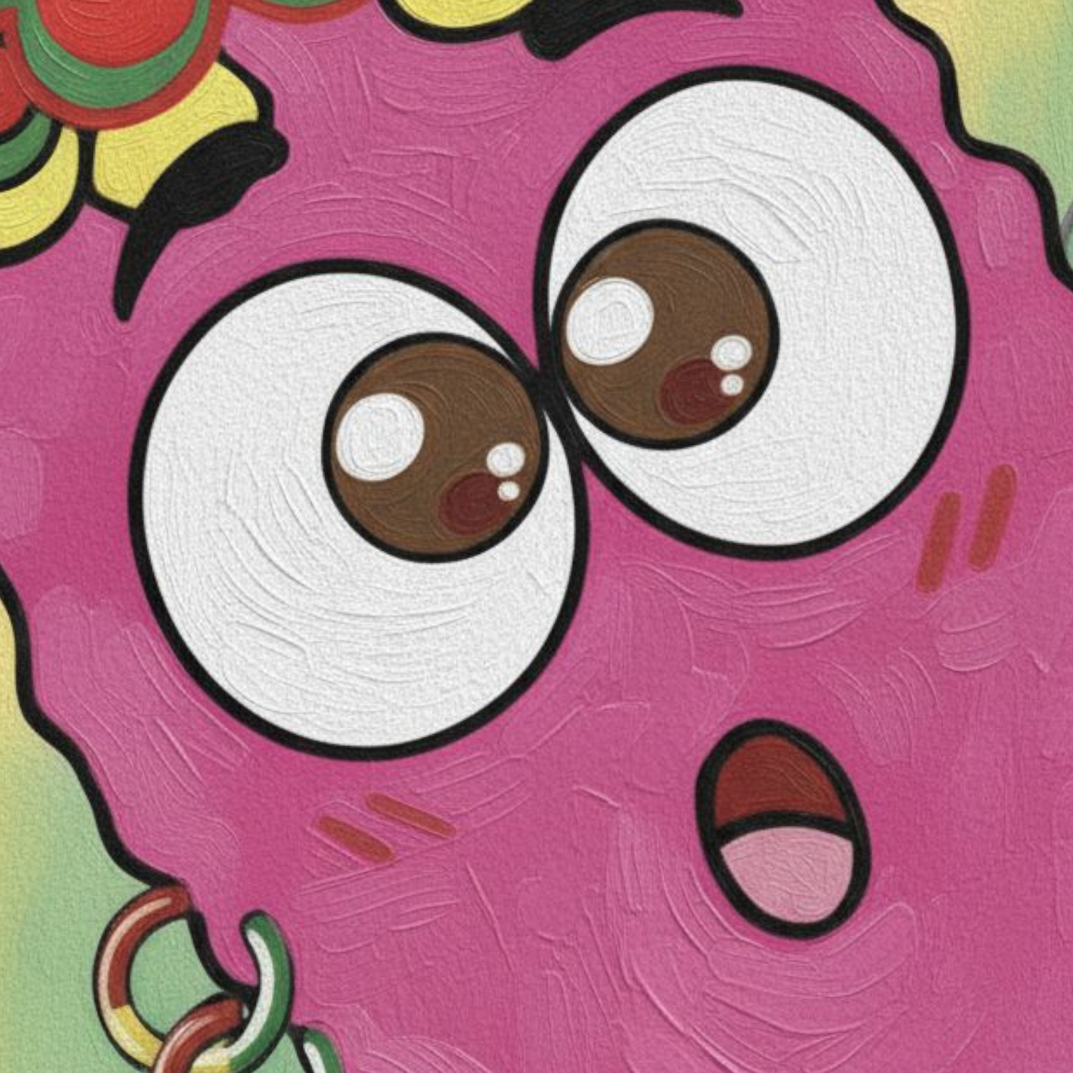 クシニョロママ氏は、この運気アゲアゲのLuckyキャラクターをモチーフに、串カツが持つ**「揚げる=運気をアゲる」**という力強いメッセージを視覚的に表現しています。