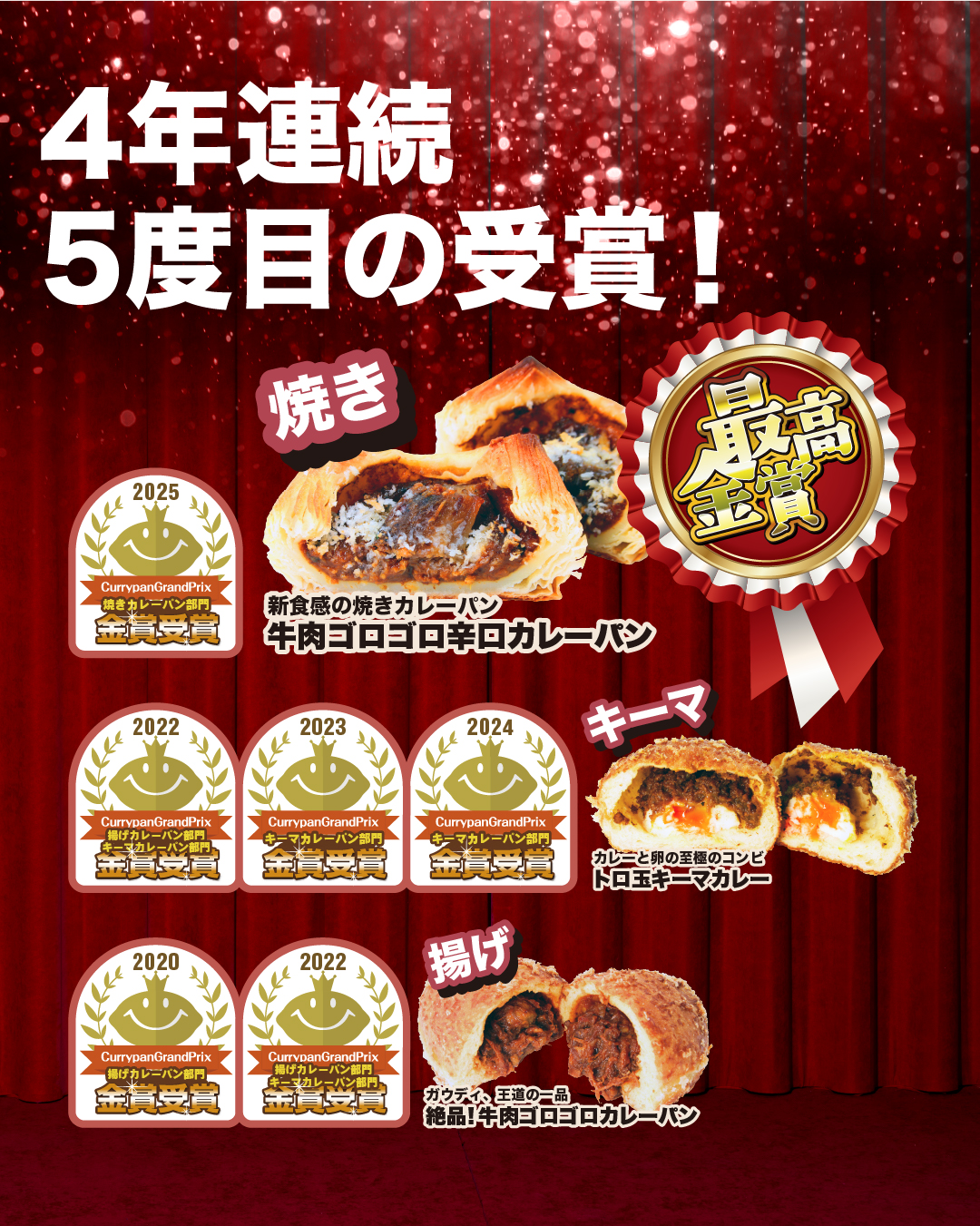 『カレーパングランプリ®️』は、「いま一番美味しいカレーパンはどれだ?」を合言葉に日本国民が選んだ、カレーパンの最前線にいるベーカリーの存在を授賞式で讃えつつ、 カレーパンの未来と共に歩む我々日本人の未来を創るため、日本一のカレーパンを決定する、年に一度の祭典です。美味しいカレーパンを知ってもらうきっかけ、カレーパンの多様性の認知、 カレーパンの地域への浸透、カレーパンの更なるイノベーションを促します。『カレーパングランプリ®️2025』では全国各地の有名ベーカリーが出場し、投票総数166,157票の中、予選を勝ち残った137種類のカレーパンから最高金賞・金賞が選出されました。(日本カレーパン協会HP:https://currypan.jp/)