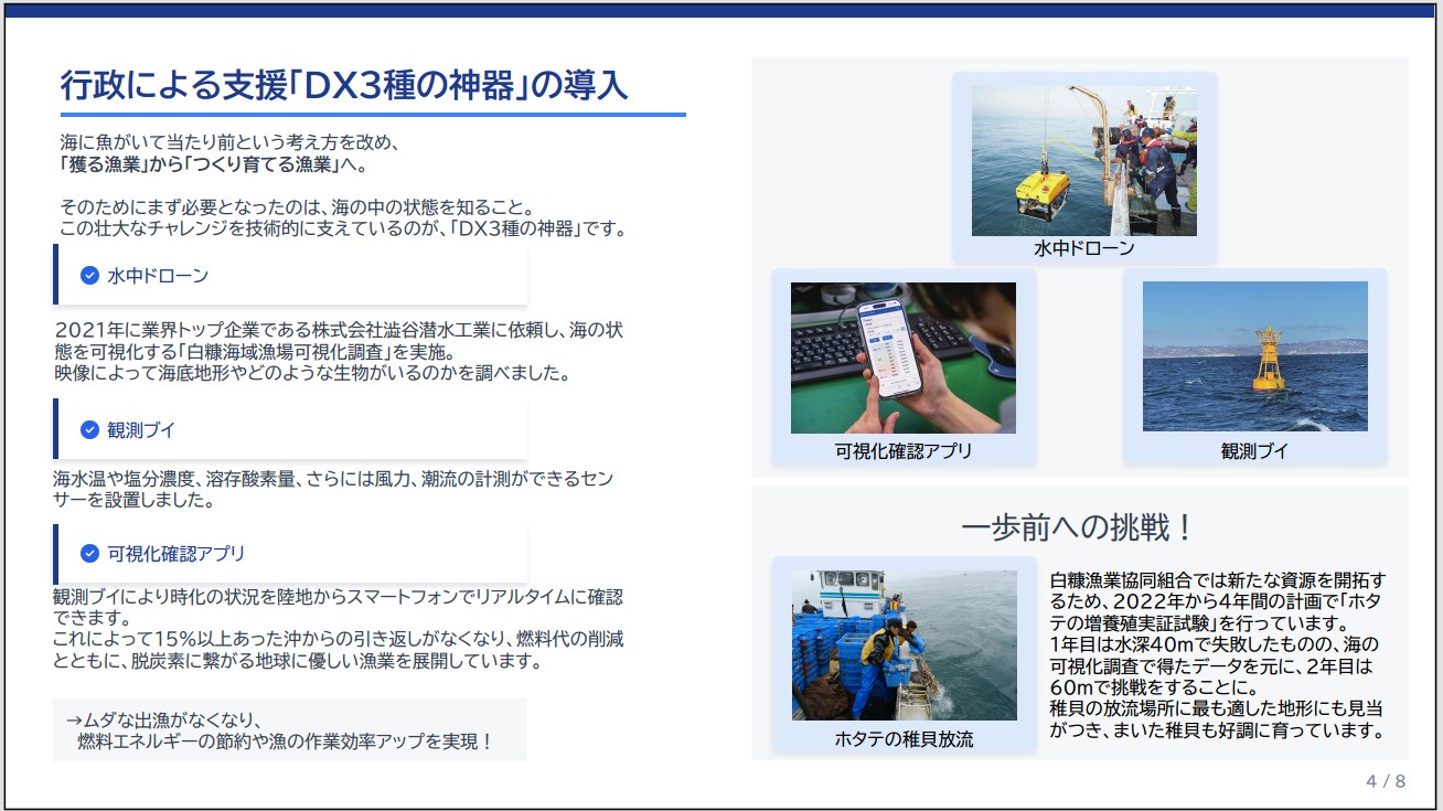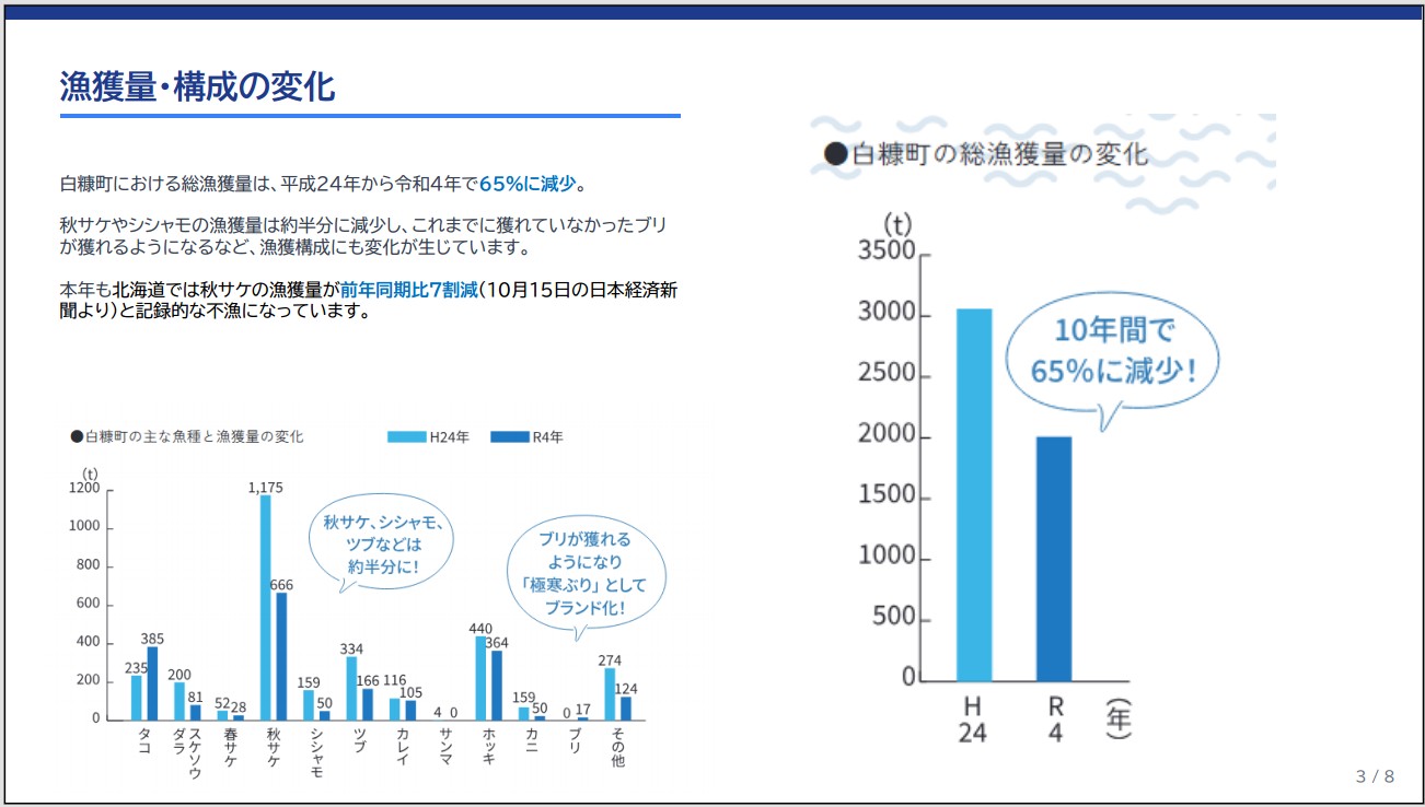 気候変動は脅威でありながら、チャンスでもあります。この変化を前向きに捉えて、官民が連携しながら、新しいイノベーションを生み出していく。それが将来50年、100年と続く白糠の漁業とまちづくりにつながると信じています。