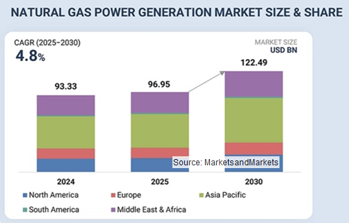 世界の天然ガス発電市場は2025年の969億5,000万米ドル規模となり、年平均成長率(CAGR)4.8%で成長し、2030年には1,224億9,000万米ドルに達するとMarketsandMarketsでは予測しています。天然ガス発電市場は、よりクリーンで柔軟性の高いエネルギー源に対する世界的な需要の高まりによって牽引されています。