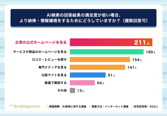 - AI検索で不満を感じた場合、Z世代はGoogle検索を経由して、企業の公式ホームページ(211人)とサービス・商品ホームページ(189人)を確認。SNS・口コミよりも、公式の出している情報が信頼に値すると認識している