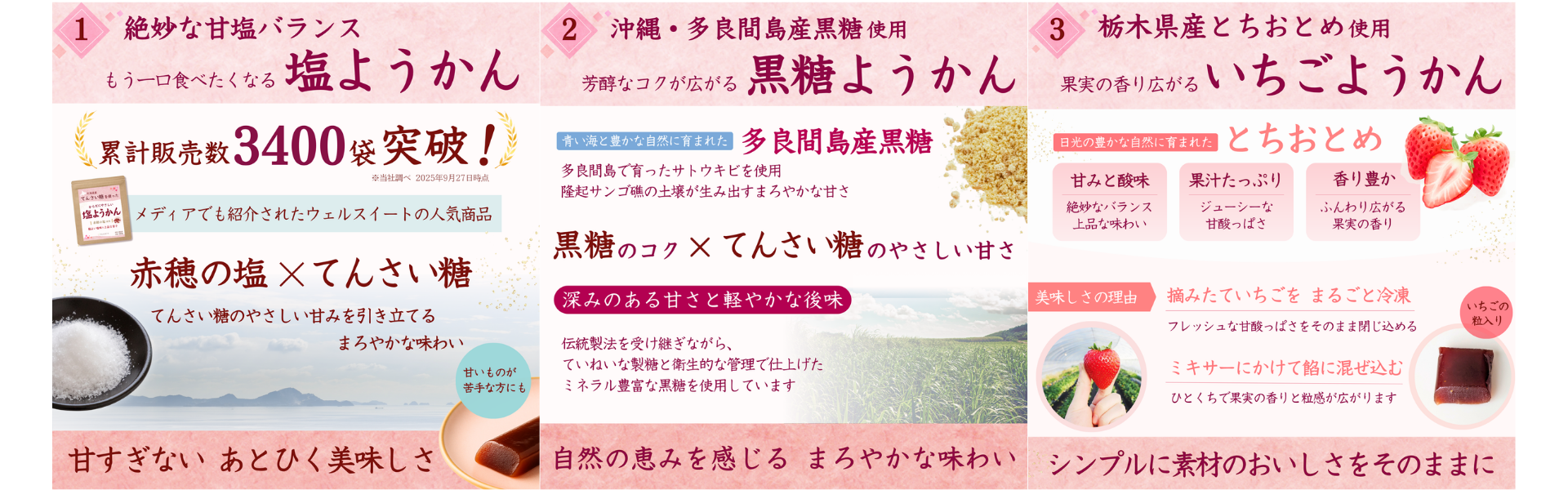 健康食品の企画・販売を手がける株式会社オンリーワン(本社:静岡県浜松市、代表取締役:平井 秀一、以下 オンリーワン)は、2025年11月16日(日)“ヨーグルトとのマリアージュ”に特化し、白砂糖不使用・てんさい糖の上品な甘さにこだわった『ウェルスイート ようかん3種セット(塩・黒糖・いちご)』をAmazonにて新発売しました。 健康のためにヨーグルトを食べるが、味のマンネリや物足りなさを感じている。一方で、甘いものは欲しいが、白砂糖や脂質による罪悪感が拭えない。本商品は、その二律背反する「健康志向のジレンマ」を解決するために開発されました。 あえて「ようかん」という伝統的な和菓子を、朝食の定番である「ヨーグルト」と融合させることで、罪悪感ゼロの新しい食習慣「ヨーグルト×ようかん」を提案します。