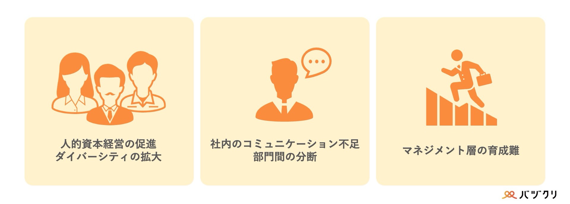 一方で、ハイブリッドワークの定着や組織のフラット化により、社内のコミュニケーション不足や部門間の分断、マネジメント層の育成難といった課題が顕在化しています。