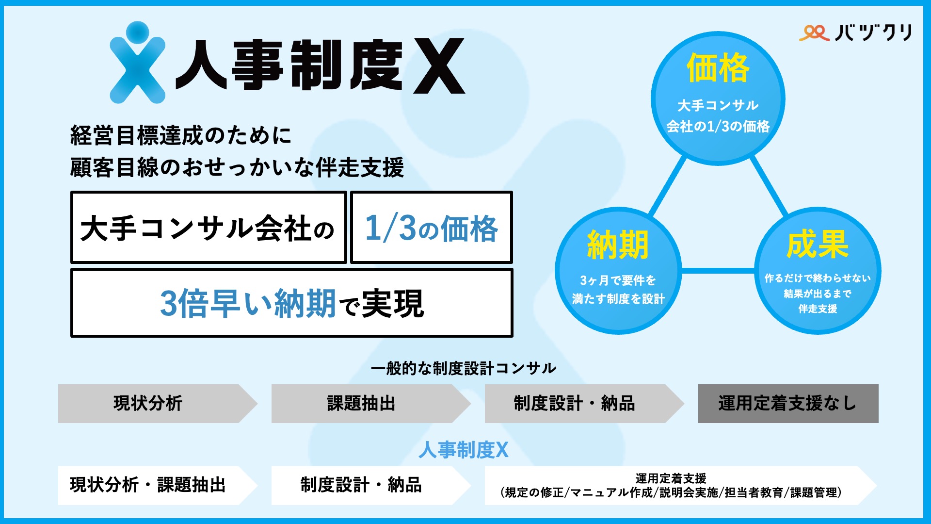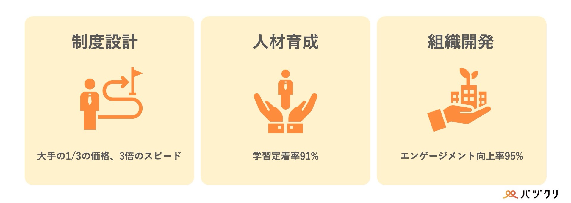 大手外資コンサルの3分の1の価格で、3倍のスピード感。制度を作るだけでなく、現場に根づくまで伴走します。