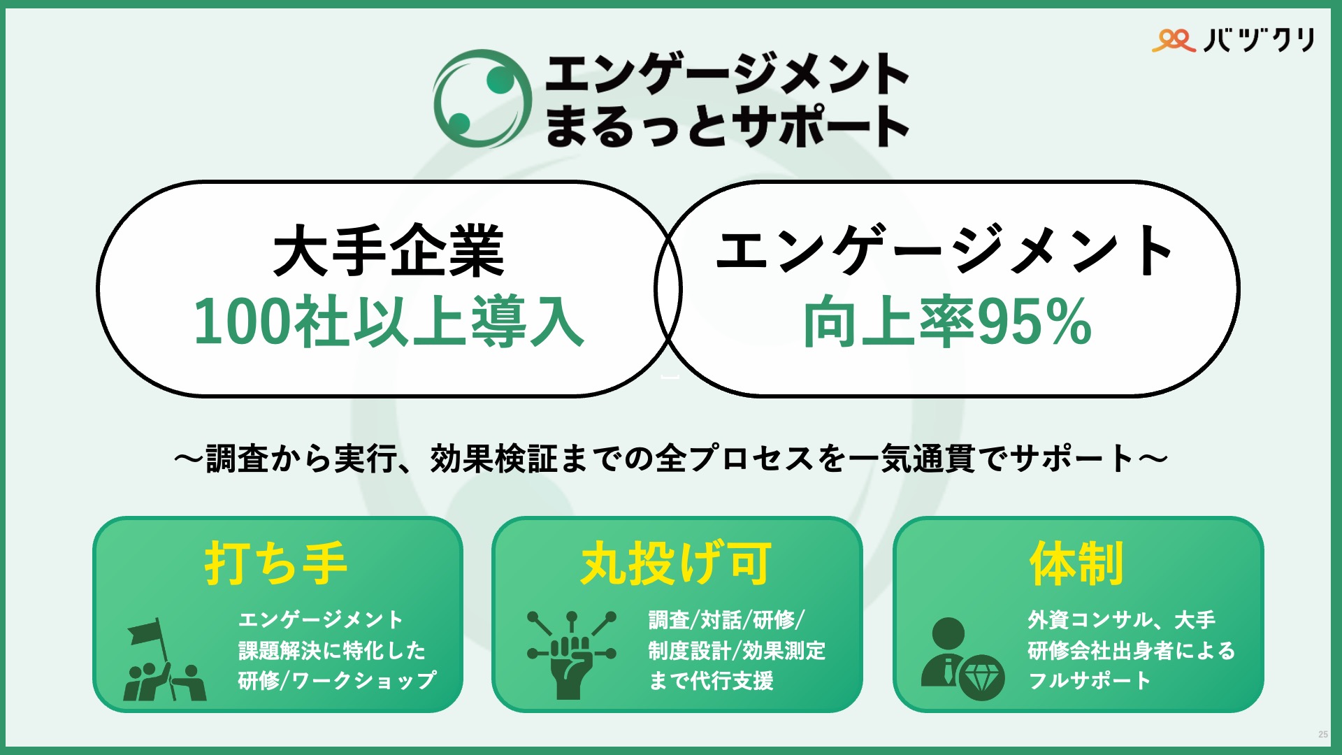 エンゲージメントサーベイの分析にとどまらず、施策実行と効果検証までをワンストップで支援。企業の課題解決をまるっと伴走するコンサルティングサービスです。