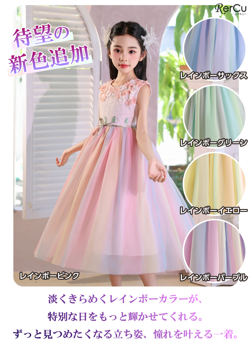 株式会社V&V(本社:福岡県北九州市、代表取締役:吉永 強)は、子供用フォーマルブランド「RerCu(レアキュー)」より、人気モデル『チュール&レースのロング丈 フラワーモチーフ付き発表会ドレス SK151』に新色のレインボーパープル・レインボーイエローを追加し、2025年11月14日(金)より販売を開始いたしました。多層チュールが花びらのように広がる華やかなシルエットと、繊細レース×立体フラワーの上品なデザインが特徴で、レインボーカラー5色と単色3色の全8色展開となります。