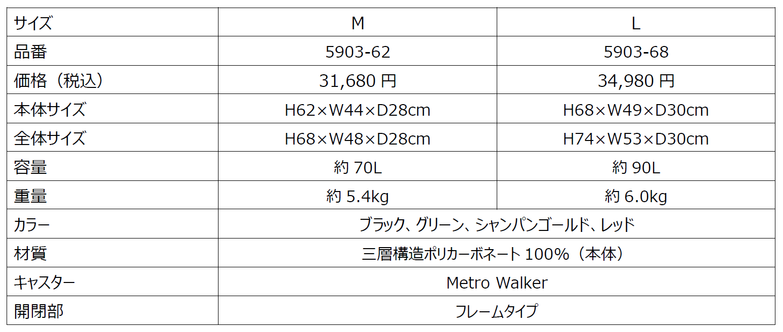 カラーは4色(ブラック、グリーン、シャンパンゴールド、レッド)で、サイズは2種類展開。5~7泊程度対応のMサイズが31,680円、7~泊程度対応のLサイズが34,980円(いずれも税込み)です。