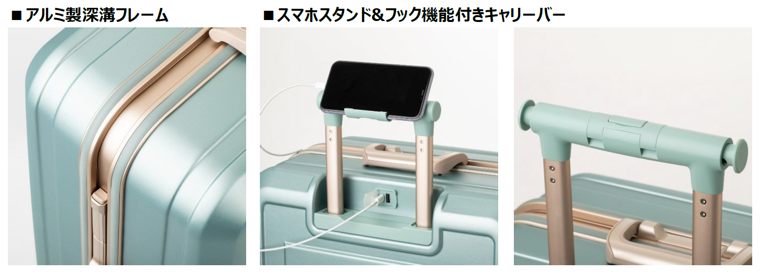 機能面では、軽量で衝撃に強いポリカーボネート100%の3層構造ボディと、衝撃に強く歪みにくいアルミ製の深溝フレーム、ちょっとした荷物などを掛けられるフック機能付き台座といった「5088」の特長はそのままに、さらなる使いやすさを追求。ベアリング構造により滑らかな操作性と静音性を実現する独自開発のストッパー付高機能キャスター「Metro Walker」をはじめ、スマホスタンドとフックを一体化したキャリーバー、USBポート(Type-A/Type-C)など、旅先での快適さを高める機能を新たに搭載しました。さらに、内装には取り外して丸洗いできる「Washtec(ウォシュテック)」を採用し、清潔さを保ちながら長く愛用できる仕様に。小分けのマチ付きポケットを備えた内装仕切りにより、小物類の整理もしやすくなりました。
