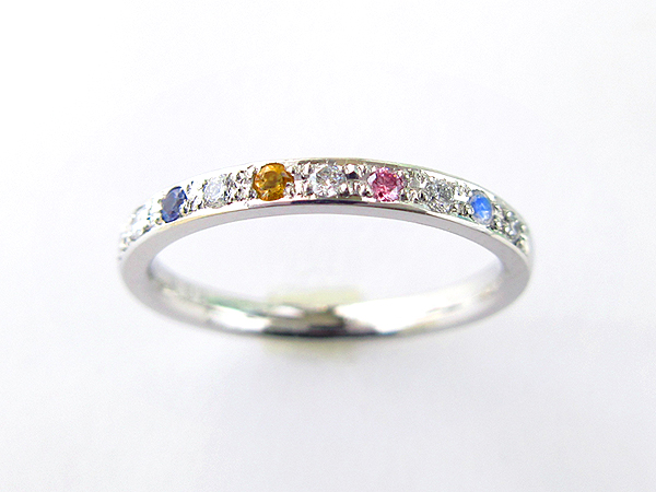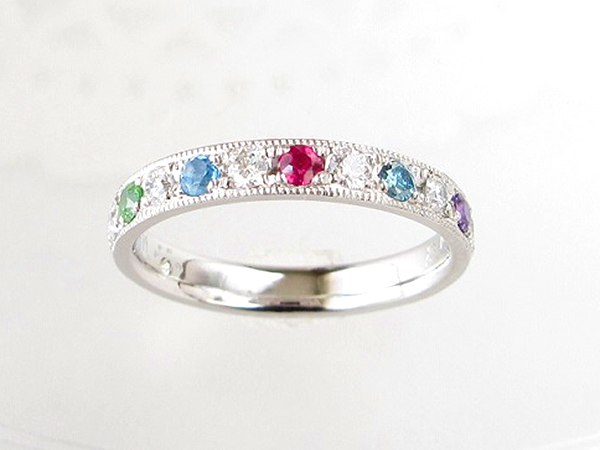 そこで、誕生石とダイヤを【交互】にセッティングすることで誕生石の彩りとダイヤの輝きが共存でき、最大限華やかに魅せることができます。