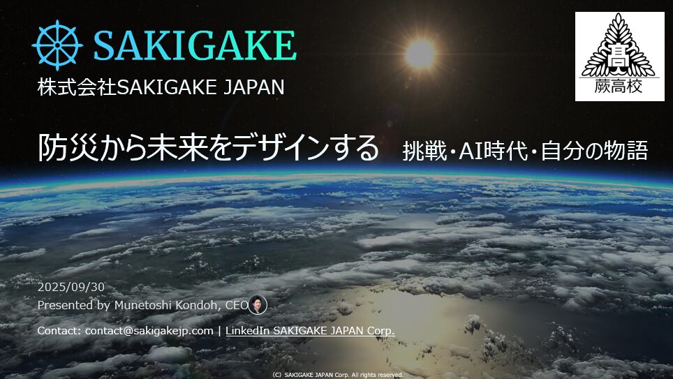 株式会社SAKIGAKE JAPAN(代表取締役:近藤宗俊、所在地:東京都港区)は、2025年9月30日、埼玉県立蕨高等学校(所在地:埼玉県蕨市)にて、「防災から未来をデザインする」をテーマとした特別講演を実施しました。本講演は、避難訓練に続く授業として行われ、防災のみならず、キャリア形成、社会課題の捉え方、AI時代の生き方など、広い視野で未来を考えるプログラムとなりました。