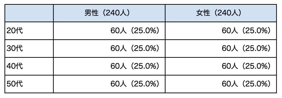 下表の通り男女、各年代とも均等なサンプルになっています。