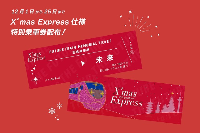 「FUTURE TRAIN」をご利用のお客様にお渡ししているピンクの乗車券が、この期間だけの特別X’mas Express仕様に!2025年クリスマス乗車の思い出にぜひお持ち帰りください。