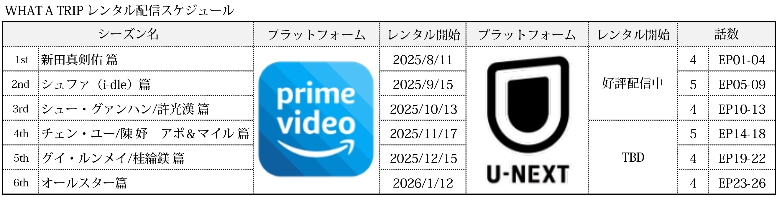 U-NEXT で独占配信されている世界的な大ヒットのタイBLドラマ『KinnPorsche The Series』(キンポルシェ)に主演してインスタグラムのフォロワーが400万人超えになり、世界中のファンを魅了したタイのトップ俳優 アポ(Apo)と マイル(Mile)が、台湾発のリアル冒険バラエティ番組『What A Trip』にゲスト出演!普段は見られないリラックスした表情や、ミッションに奮闘する素顔をお見逃しなく。
