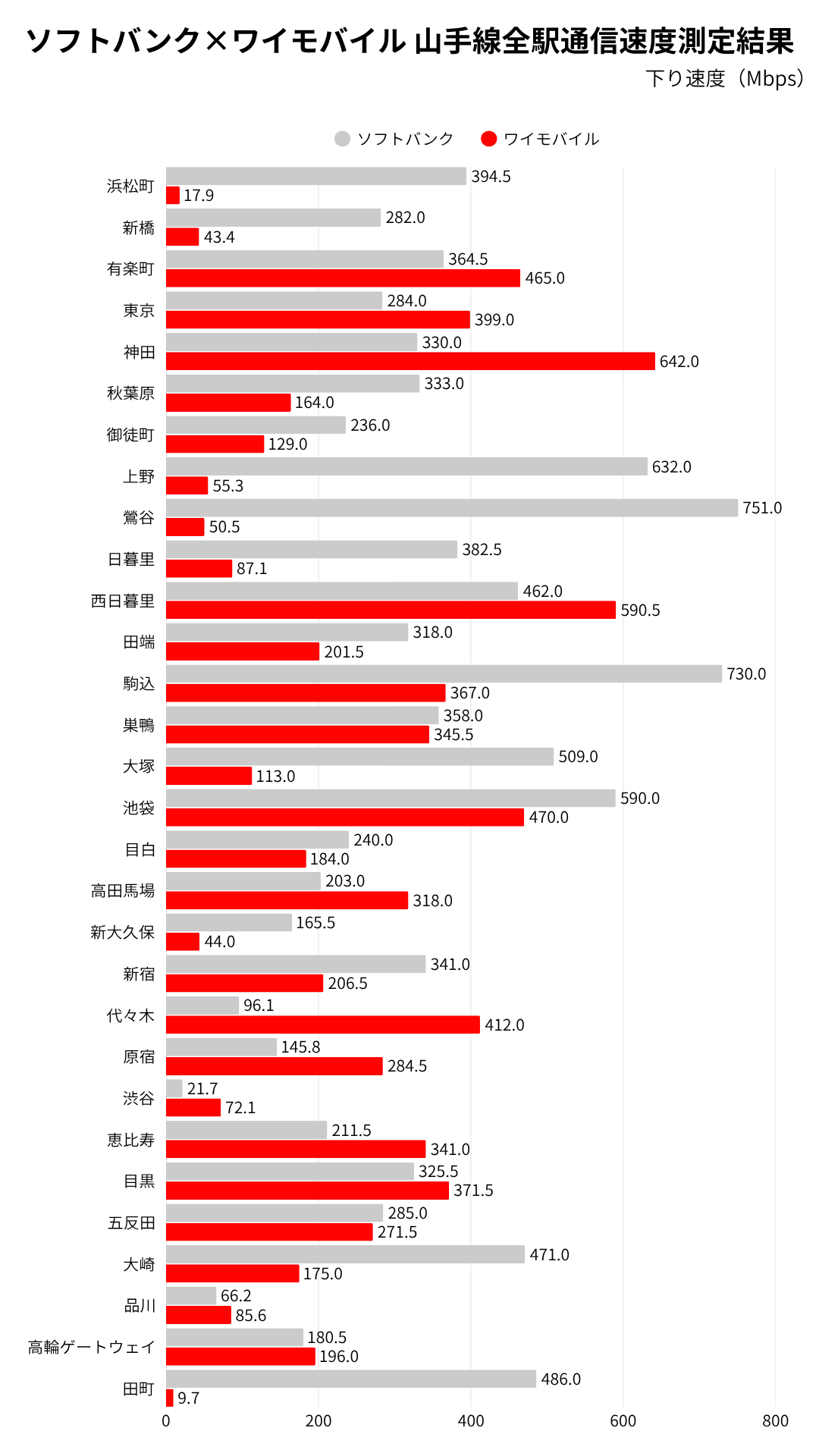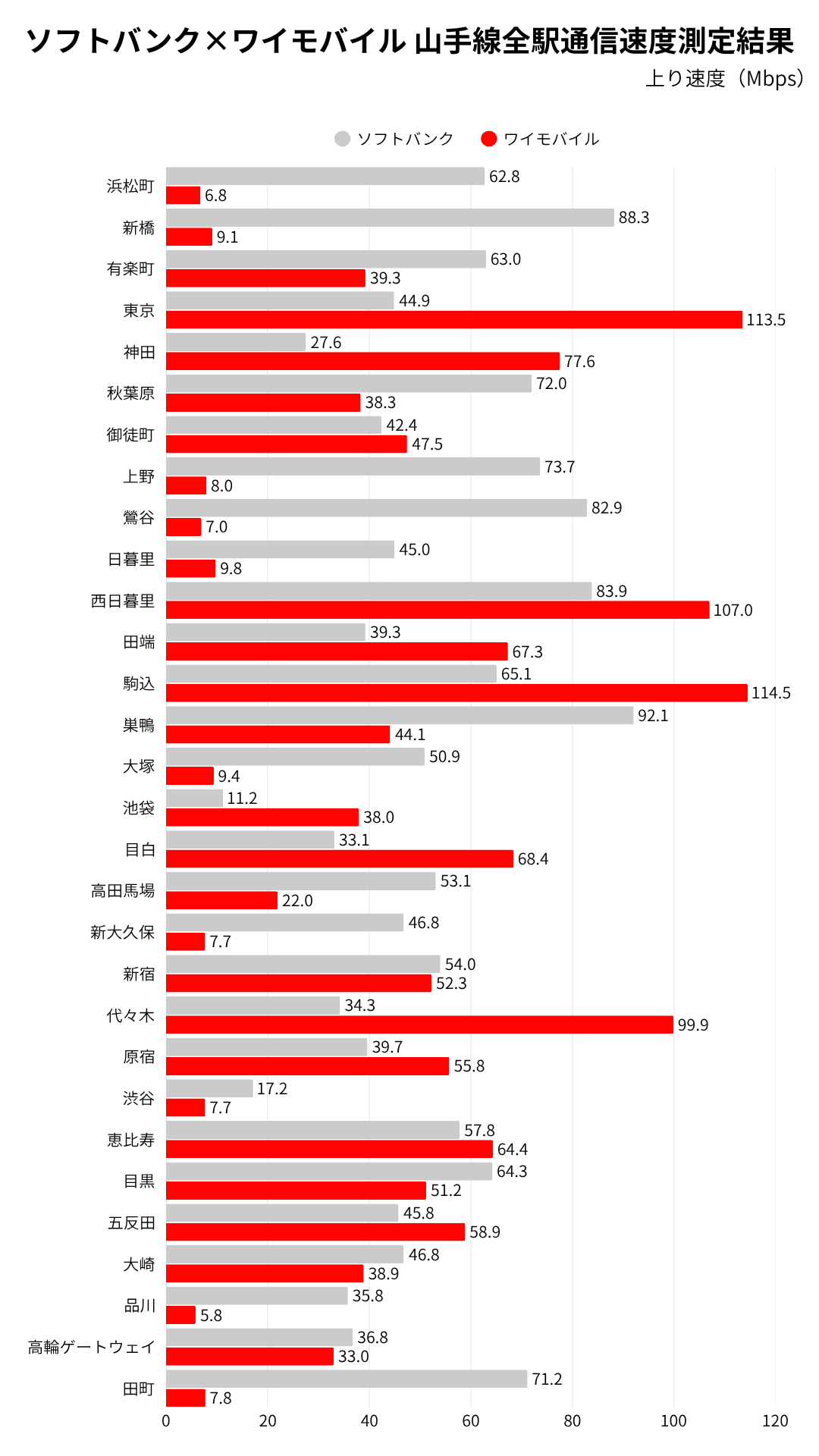【ソフトバンク×ワイモバイル 通信速度調査】山手線全30駅で実測比較を実施