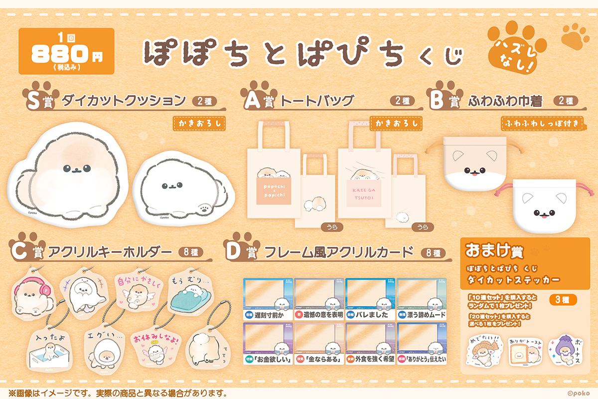 「ぽぽちとぱぴち くじ」では、描きおろしイラストを使用した「ダイカットクッション」をはじめ、「トートバッグ」、「ふわふわ巾着」などが賞品となっています。
