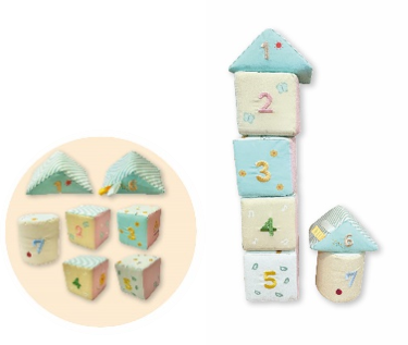 布製でやわらかくて赤ちゃんにやさしい、はじめてのつみき遊びにぴったりのセット。