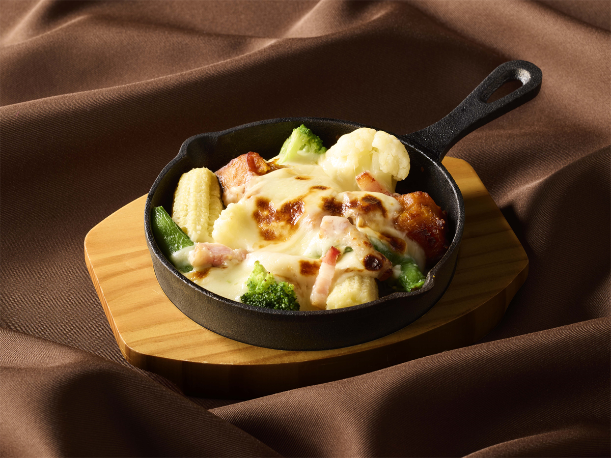 また、「5種野菜とチーズソースのオーブン焼き」は、温野菜とスティックベーコンにチーズソースをたっぷりかけ、オーブンで焼き上げたこの時期にぴったりな熱々の一品です。追加の一皿としてはもちろん、お酒のお供としてもお召し上がりいただけます。