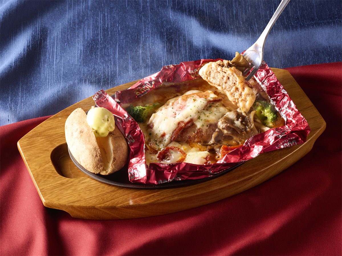 5種(チェダー・レッドチェダー・ブルーチーズ・パルメザン・モッツァレラ)のチーズを使ったソースと、セミドライトマト入りのトマトソースを合わせた包み焼きハンバーグです。たっぷりかかったチーズソースは、まるでチーズフォンデュのチーズのようにまろやかで優しい味わいです。甘みが凝縮されたセミドライトマトが入ったトマトソースを合わせているため、濃厚なチーズに程よい酸味が加わり、最後まで飽きることなくお召し上がりいただけます。