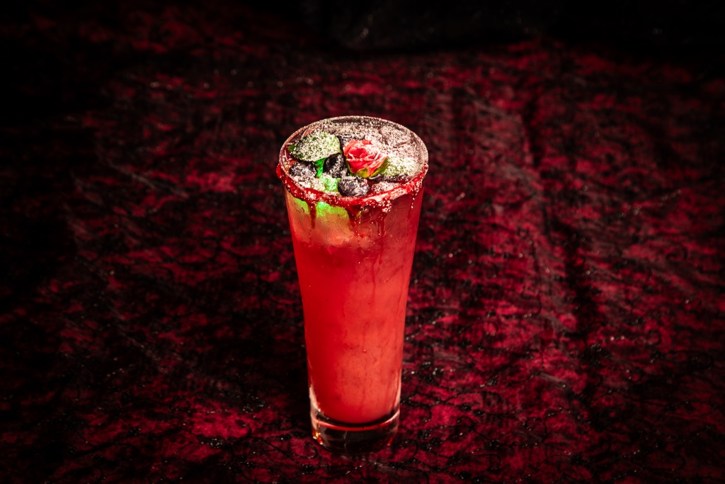闇夜のようなほの暗い城で怪しく光り浮かび上がるのはオリジナルカクテル「ホーリーブラッド」。