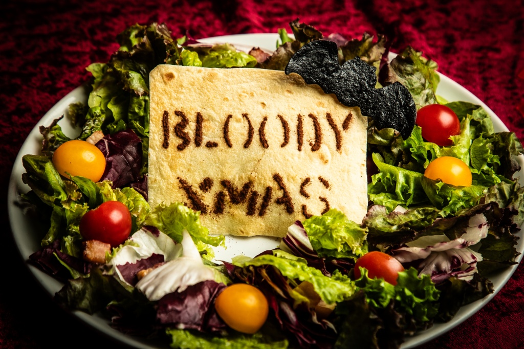 伯爵からの招待状を受け取り城へ入ることを許されたゲストを迎えるのは、生物が身を縮める寒き冬という季節にも関わらず、不思議と瑞々しさを讃えるクリスマスリース…型のサラダ。一見すると葉物野菜とプチトマトだけのシンプルサラダですが、美味しい味つけの魔力が掛かっているので、そのままでどうぞ。