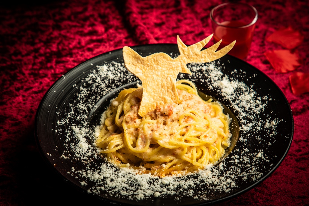 その姿は真白き雪原を駆け抜けるトナカイ。しかし何故か名には”血塗れ”の文字が…! そう、魔界の住人たちと呪文を唱える恒例の儀式がこの皿を完成させるために行われるのです。”血“という仮の姿をしたトマトソースが濃厚なクリームにアクセントを加え、闇のトナカイ=美味を呼び覚ましてくれます。