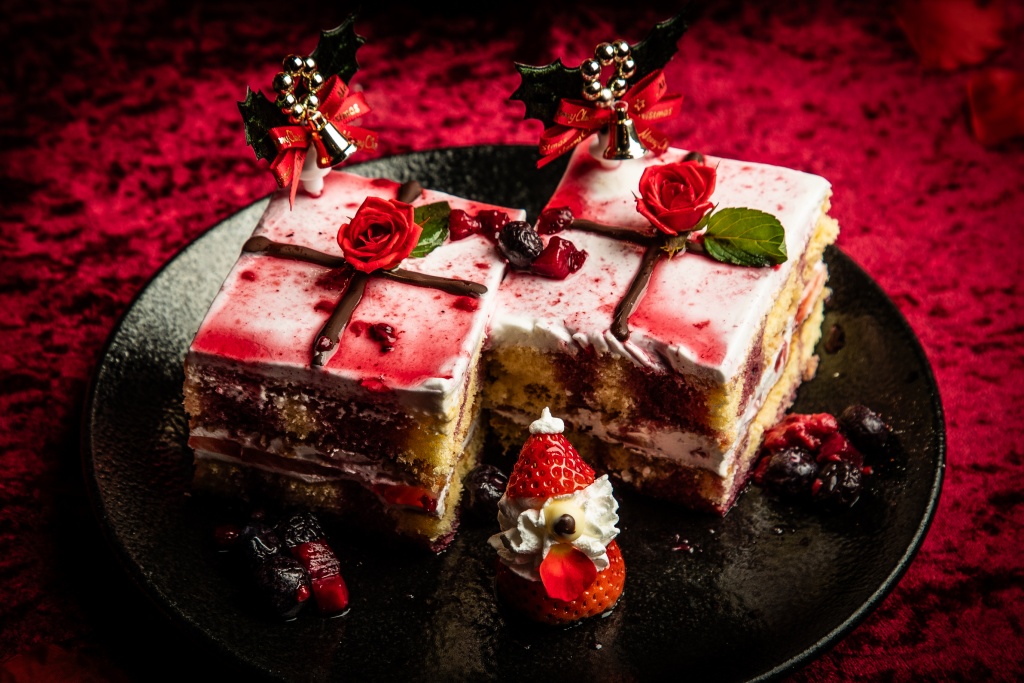 聖夜の宴の締めくくりには、伯爵以下魔界の住人たちからの心尽くしの贈り物をお受け取りください。主人のモチーフ・薔薇があしらわれたショートケーキは、ふんわりと軽く控えめな甘さで、ベリーソースの甘酸っぱさも加わり、フルコースを堪能しても尚口に運ぶ手が止められなくなるデザートです。