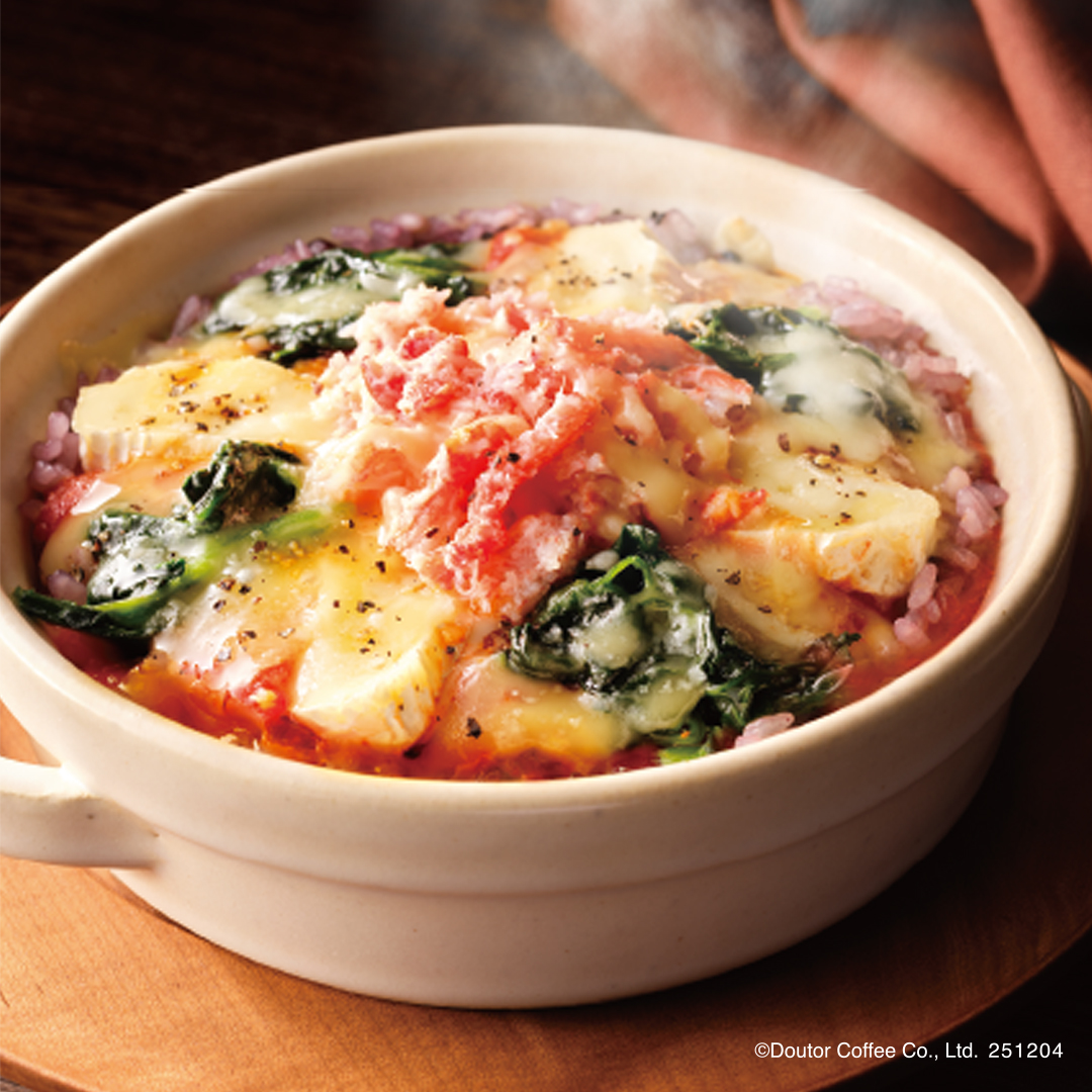 雑穀ご飯にまろやかなホワイトソースと爽やかな酸味のトマトソースを重ね、紅ズワイガニとカマンベールチーズをトッピングしています。仕上げにとろけるシュレッドチーズとパルミジャーノを重ね、蟹の風味が引き立つコクのある味わいに。ひと口ごとに広がる蟹とチーズの贅沢なハーモニーをぜひご堪能ください。