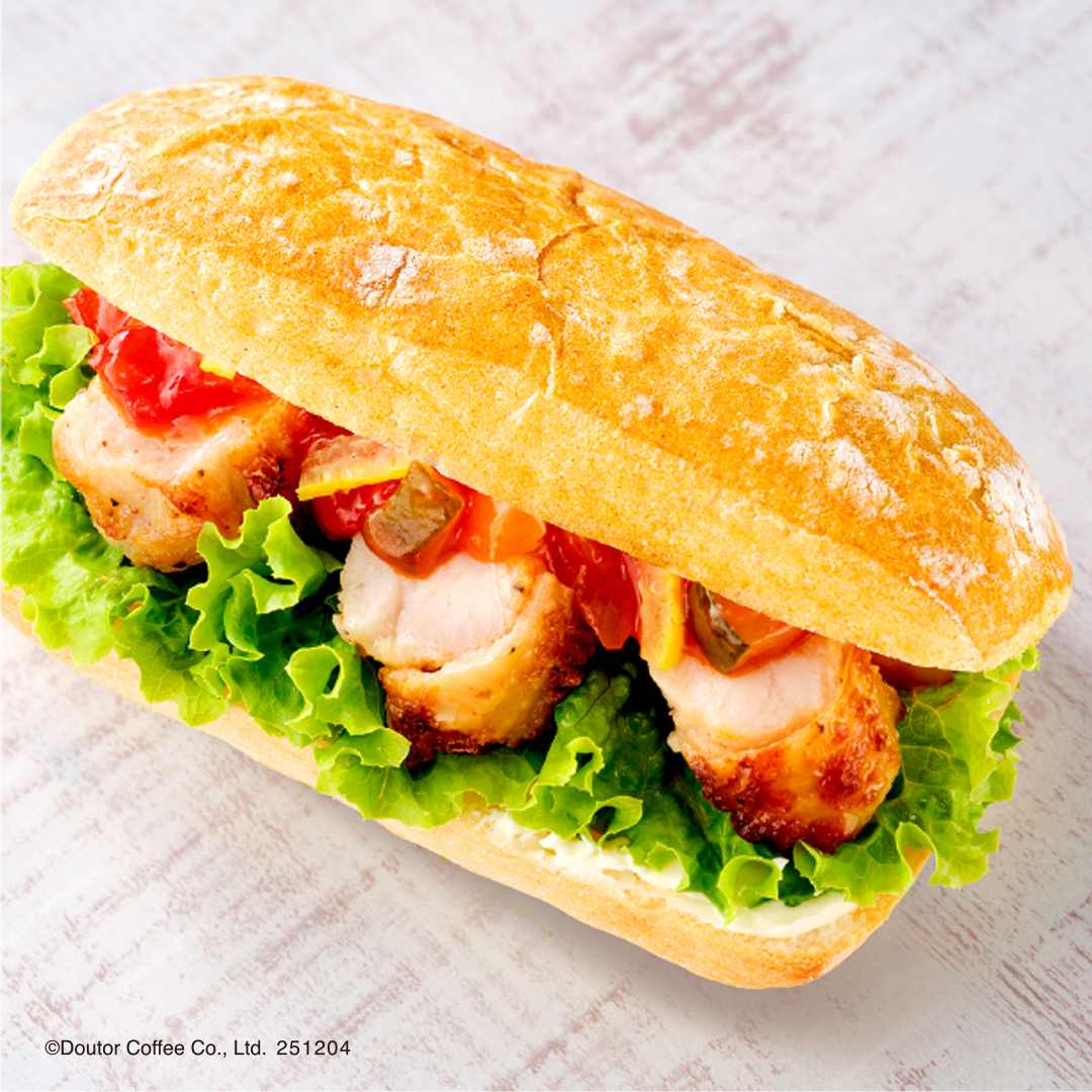 カポナータソースの甘酸っぱさがチキンのジューシーさと調和し、クリームチーズソースがまろやかさをプラスしています。柚子の香りがアクセントになり、爽やかな後味のチャバッタサンドです。