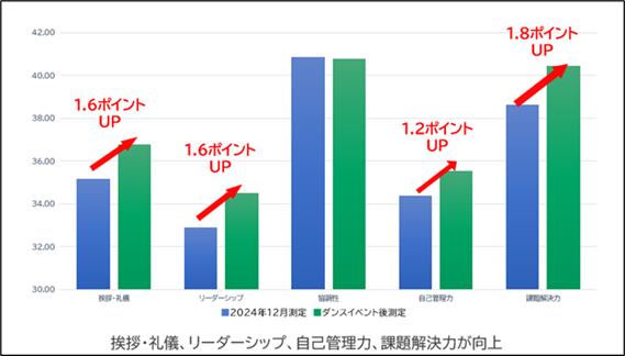 「イクスピアリ」でのダンス発表会に参加した子どもたちの非認知能力が向上し、中でも挨拶・礼儀、リーダーシップ、自己管理力、課題解決力が伸びたことがわかりました。