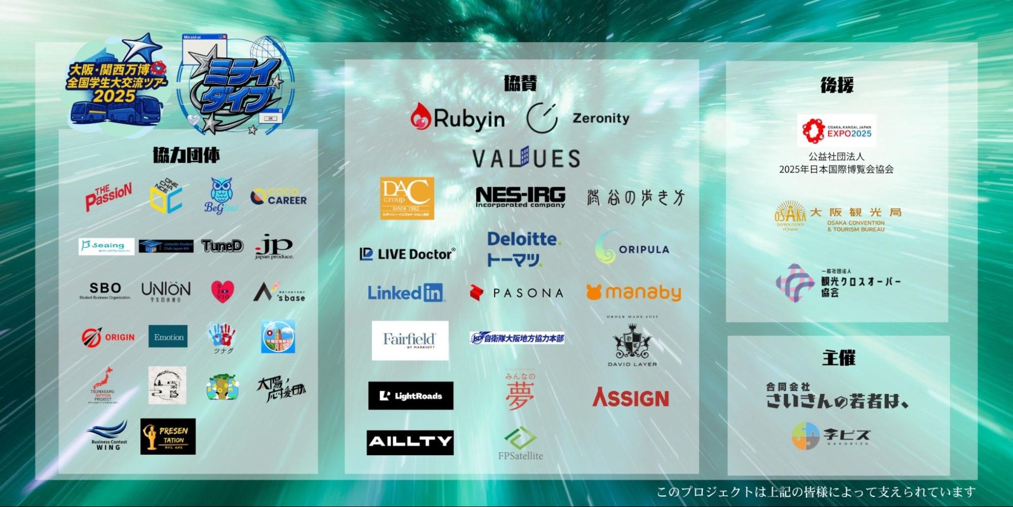 Zeronity株式会社(所在地:東京都新宿区、代表取締役CEO:加藤 寛大)は、ルビーイン株式会社(所在地:神奈川県大和市、代表取締役:千手 禅二郎)と共に、合同会社さいきんの若者は、(所在地:東京都新宿区西新宿、代表 宮本 伊織、の主催する2025年日本国際博覧会(大阪・関西万博)が後援し学生が主体となって企画・運営する「集まれ!大阪・関西万博全国学生大交流プロジェクト」に共同の冠スポンサーとして協賛し、同イベントの基調講演「若くして挑戦する価値」に代表の加藤が登壇したことをお知らせいたします。