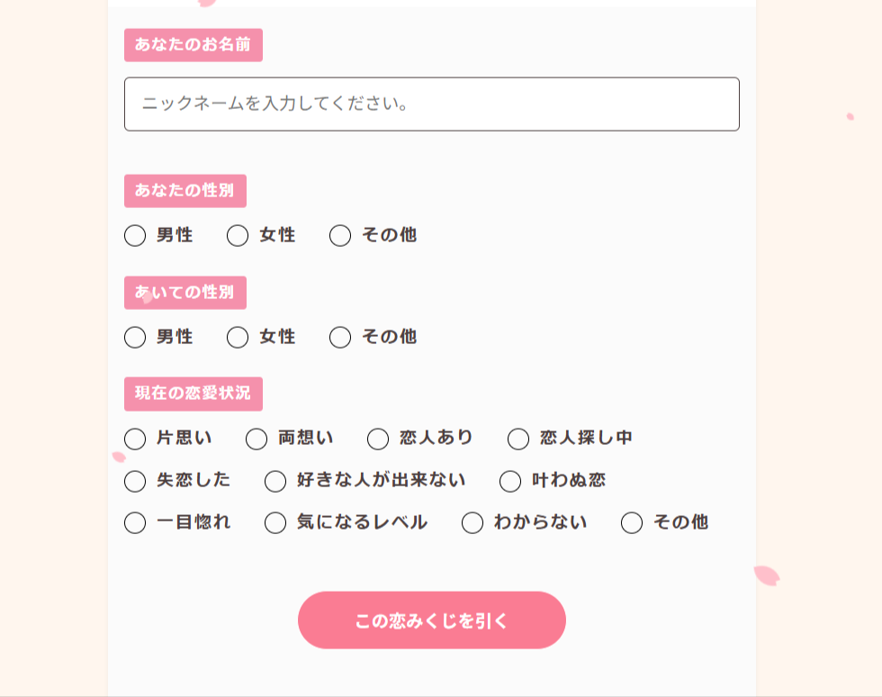 今回のアップデートで、恋みくじを引く前に以下の項目を選べるようになりました。