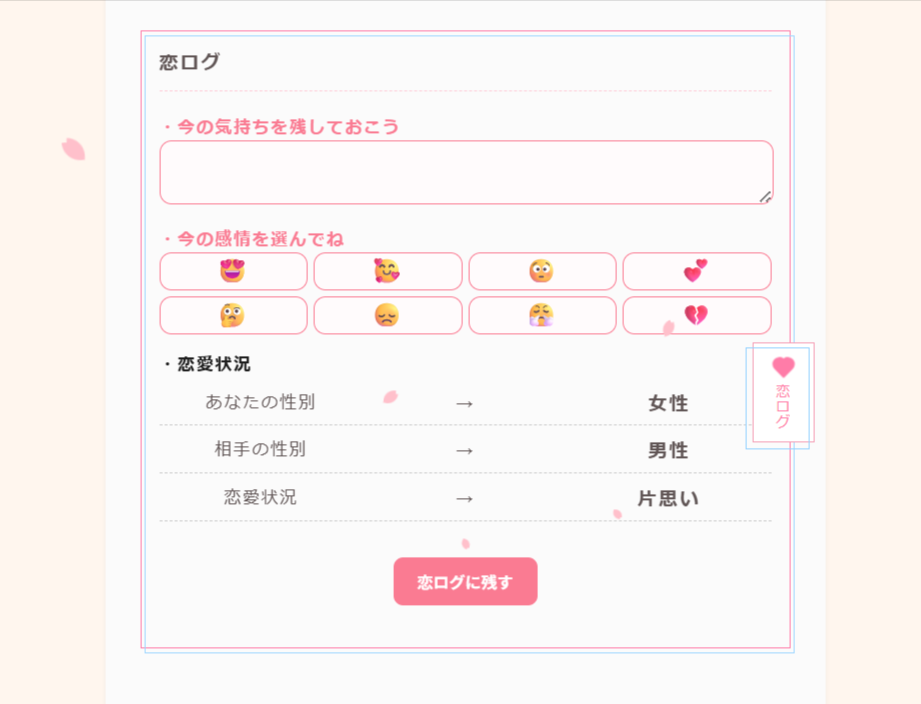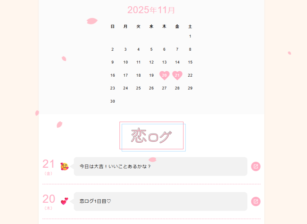 入力した文章と絵文字は、恋ログページに一覧で表示され、日記のように読み返せます。