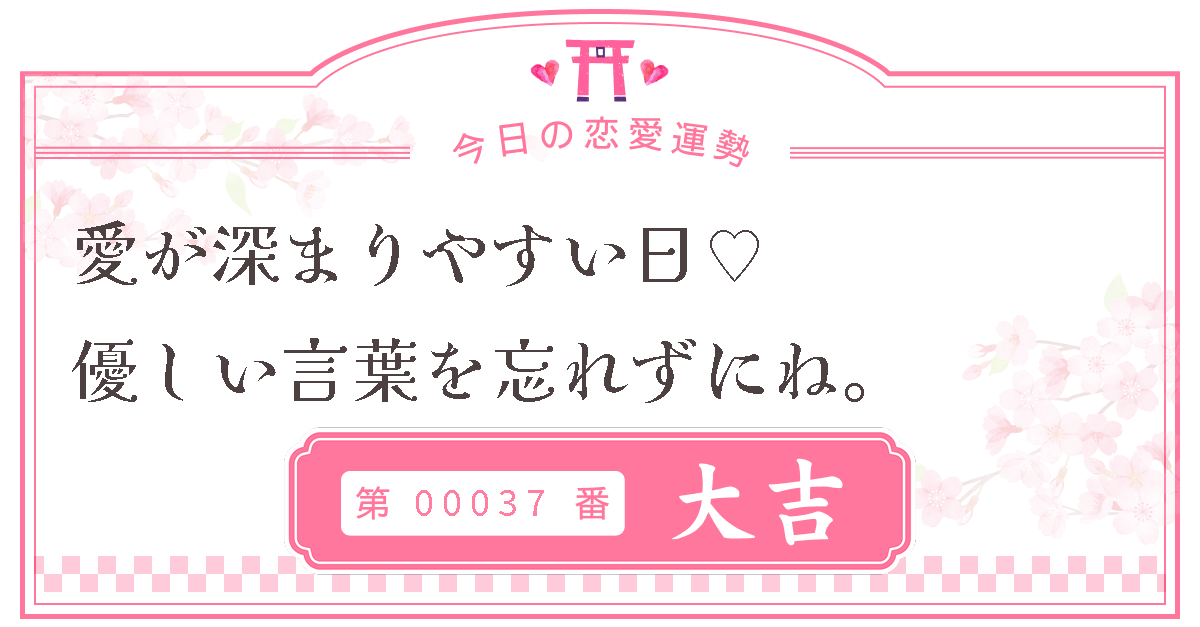 結果は7段階の恋愛運(大吉/吉/中吉/小吉/末吉/凶/大凶)と、恋にまつわるその日のひとことメッセージがセットで表示されます。