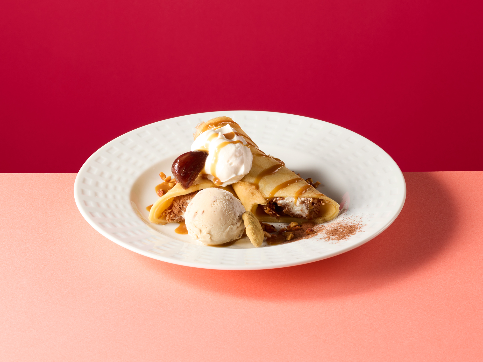 優しい甘さのホイップと濃厚なマロンペーストを、もちもちのクレープで巻いた一皿です。