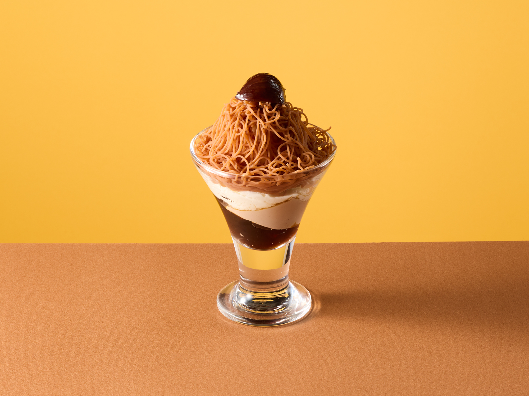 紅茶ゼリーの華やかな香りが、マロンの甘みを引き立てます。食後にもぴったりな、さっぱりとしたグラスデザートをお楽しみください。