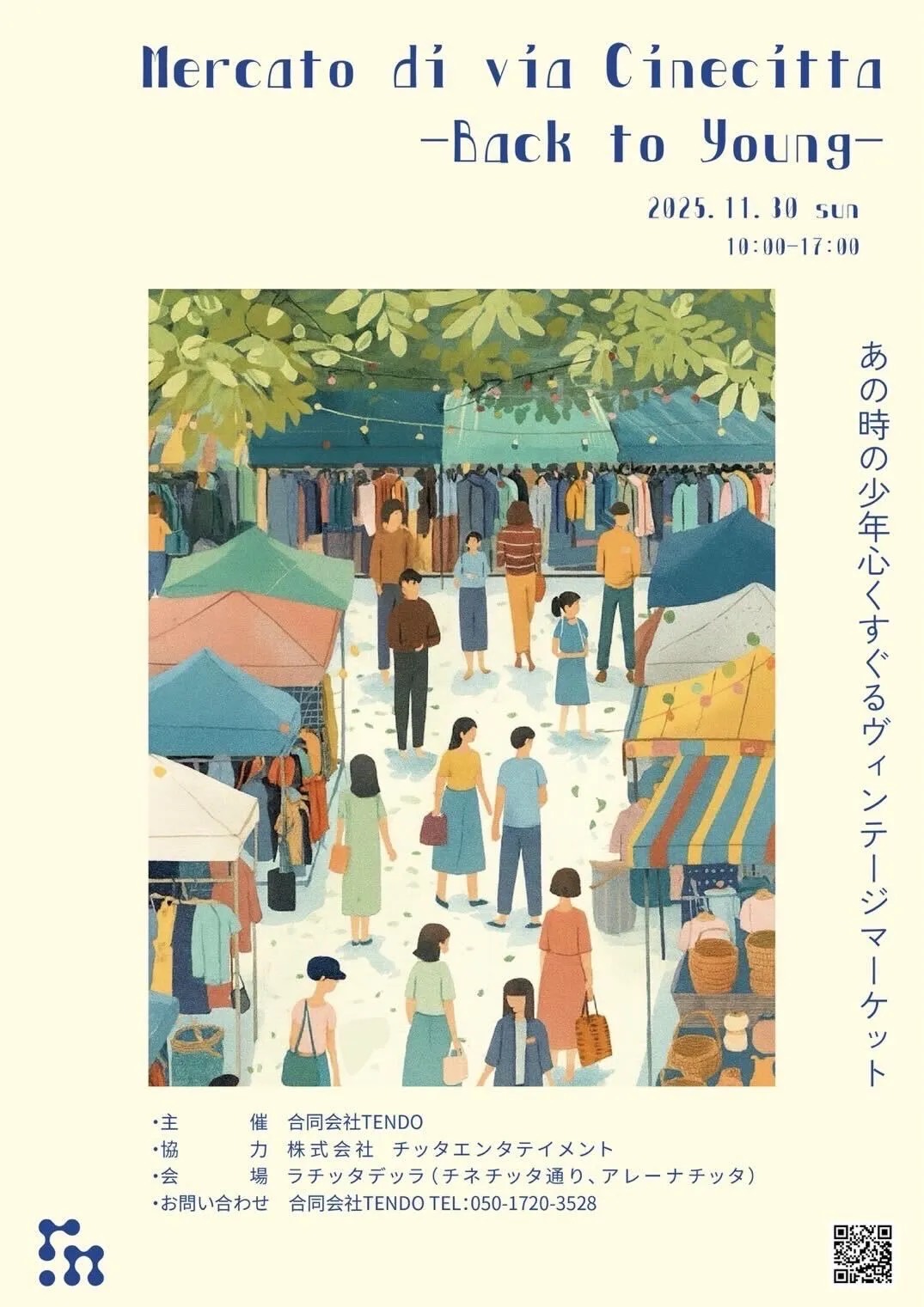 合同会社TENDO(本社:神奈川県川崎市/代表社員:遠藤俊明)と、株式会社 チッタ エンタテイメント(本社:神奈川県川崎市/代表取締役社長:美須アレッサンドロ)は、川崎に特化したファッションメディア「Mercato(メルカート)」が手がける、ヴィンテージマーケットと蚤の市をミックスした初開催イベント『Mercato di via Cinecittà -Back to young-』を、11月30日(日)の1日限定で、イタリアのヒルタウンをモチーフとした複合商業施設「ラ チッタデッラ」(川崎市)にて開催いたします。今回は、まもなく開催を迎える本イベントの詳細情報をお届けいたします。