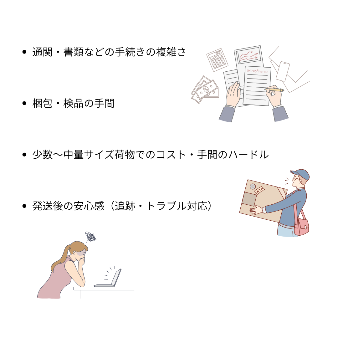 例えば、商品写真を送るだけで 書類作成・通関対応を代行。梱包・検品もサービスに含まれ、1箱から大量まで同一の手軽さで依頼可能。複数国・発送先にもまとめて対応し、リアルタイム追跡・保険制度も備えています。