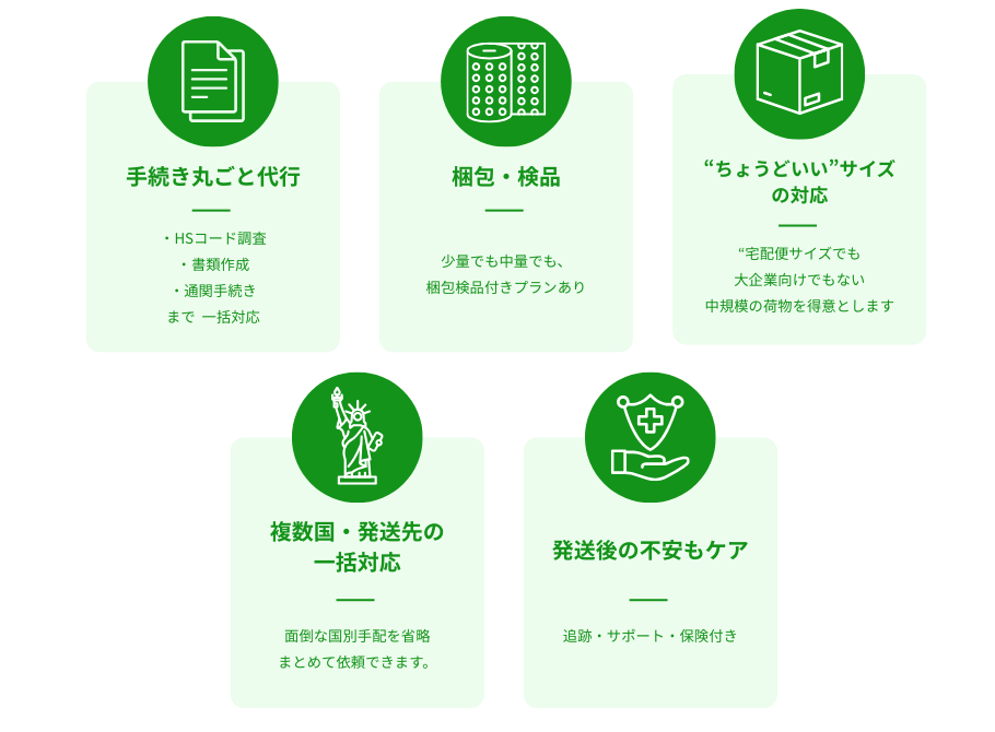 海外発送をもっとスムーズに、もっと身近に。私たちは、より多くの方に安心してご利用いただけるサービスをめざし、これからも品質向上に努めてまいります。
