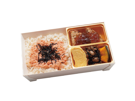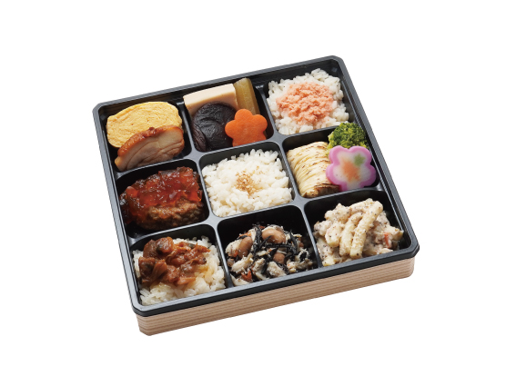 おだしがきいた様々なおかずと、鮭やあさりの佃煮、炒りごまを乗せただし炊き込みご飯を彩り豊かに詰め合せたお弁当です。ぽん酢ジュレがけのハンバーグや粗挽き胡椒のマカロニサラダなど、冬季限定のお惣菜もお楽しみいただけます。