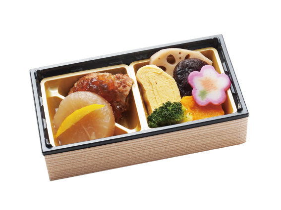 ぽん酢ジュレをかけたハンバーグやゆず香るだし炊き大根など、冬にぴったりのおかずをだしがきいた煮物や玉子焼き等と一緒に彩りよく盛り合せました。