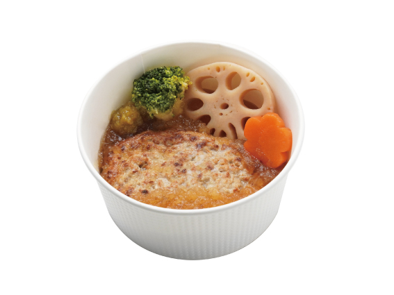 ハンバーグにだしのきいた大根おろしジュレをたっぷりとかけたボリューム感のある一品です。お好みで柚子胡椒をつけて召し上がりください。