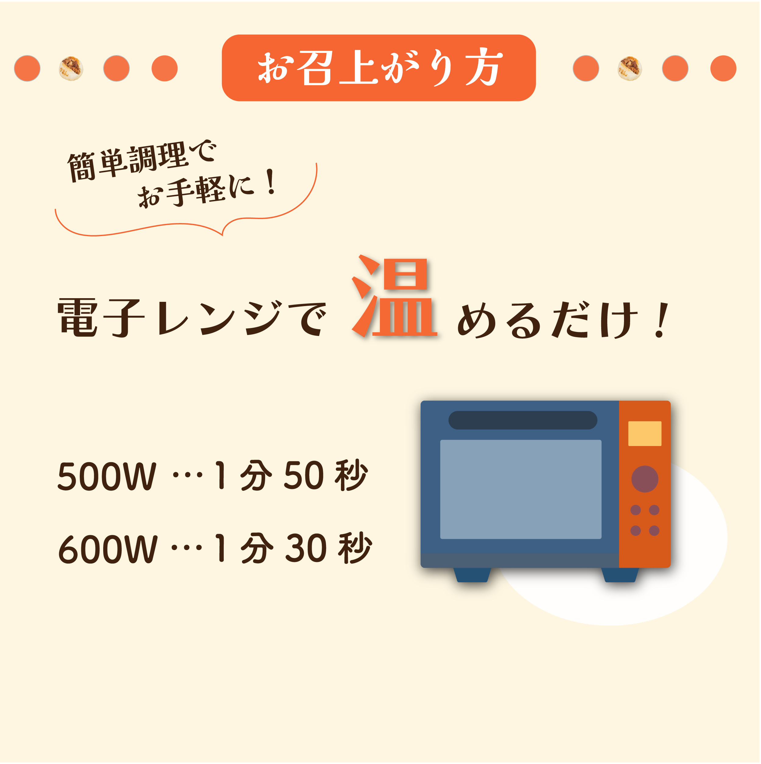冷凍のまま電子レンジで約90秒(700W)。鍋も火も食器も不要です。