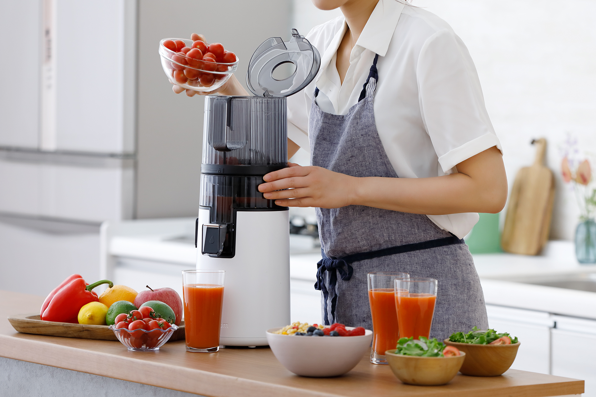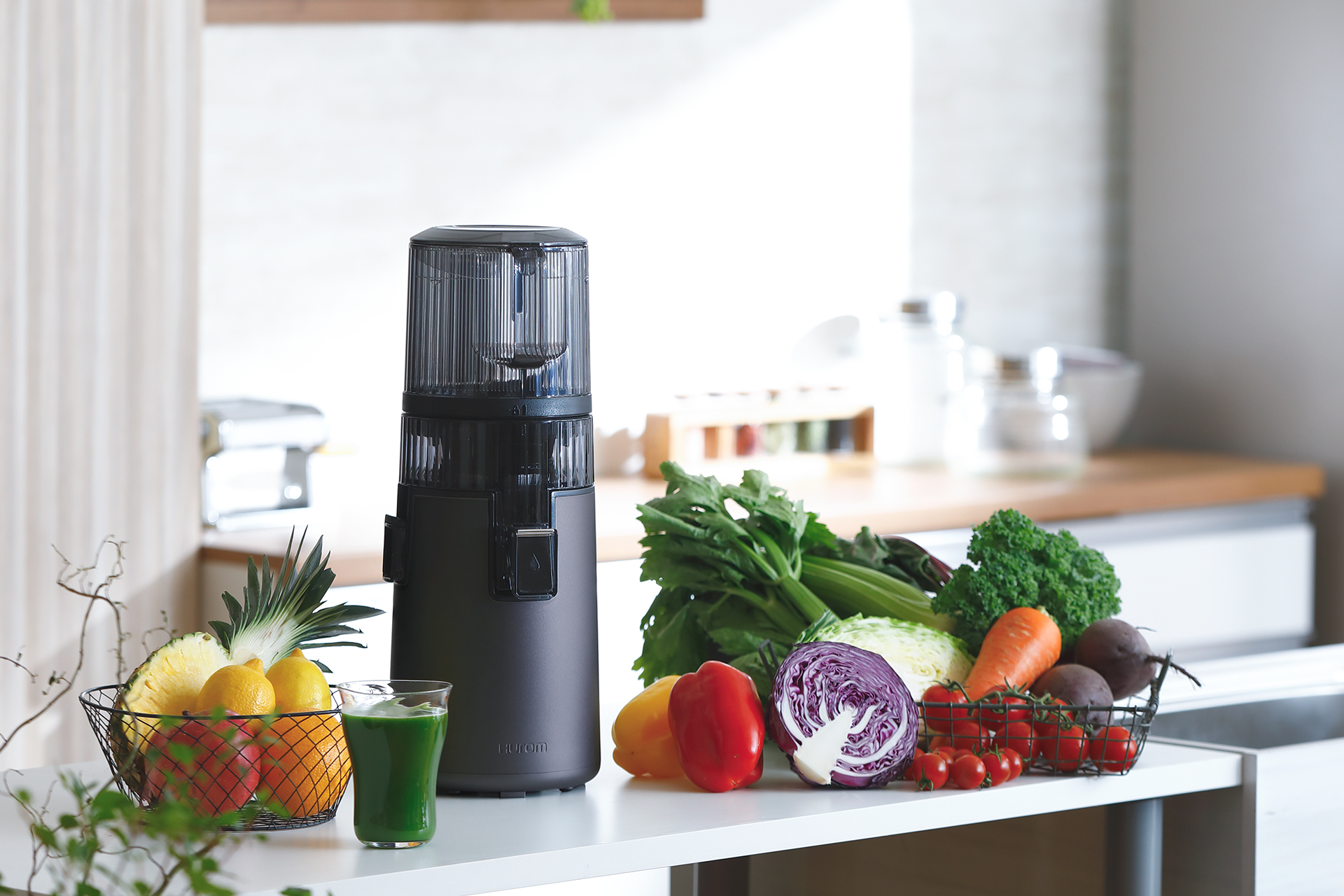 ヒューロムのコールドプレスジューサーは、独自技術の低速搾汁方式(スロースクイージング テクノロジー)で搾るため、熱に弱い酵素やビタミンを壊しにくく、素材本来の風味や栄養が詰まった生ジュースを作ることができます。