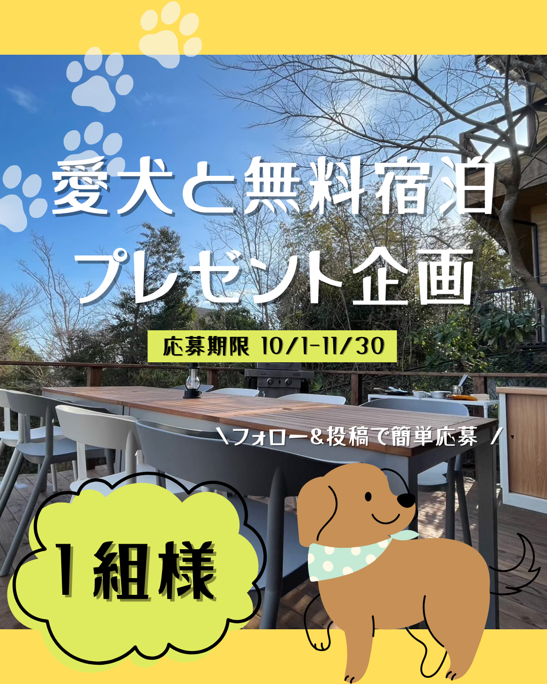 贅沢な時間を愛犬と共に過ごす一棟型貸切宿『Koco伊豆高原』では11月30日まで 「無料宿泊体験」が当たるフォト企画を開催しております。