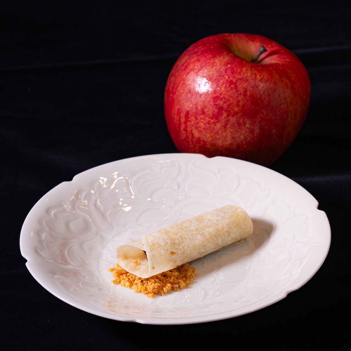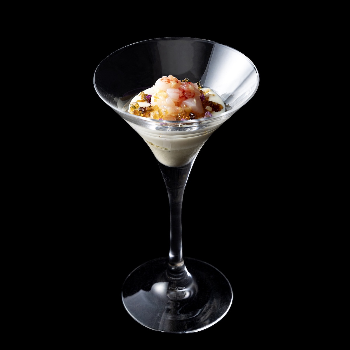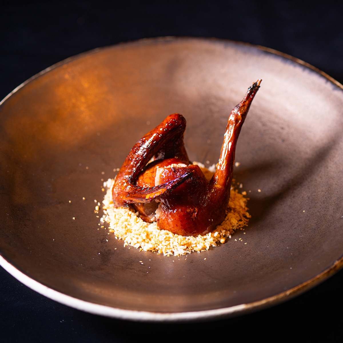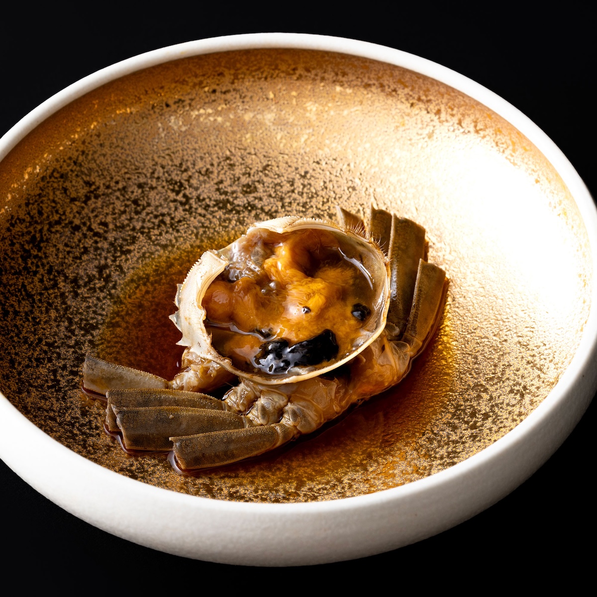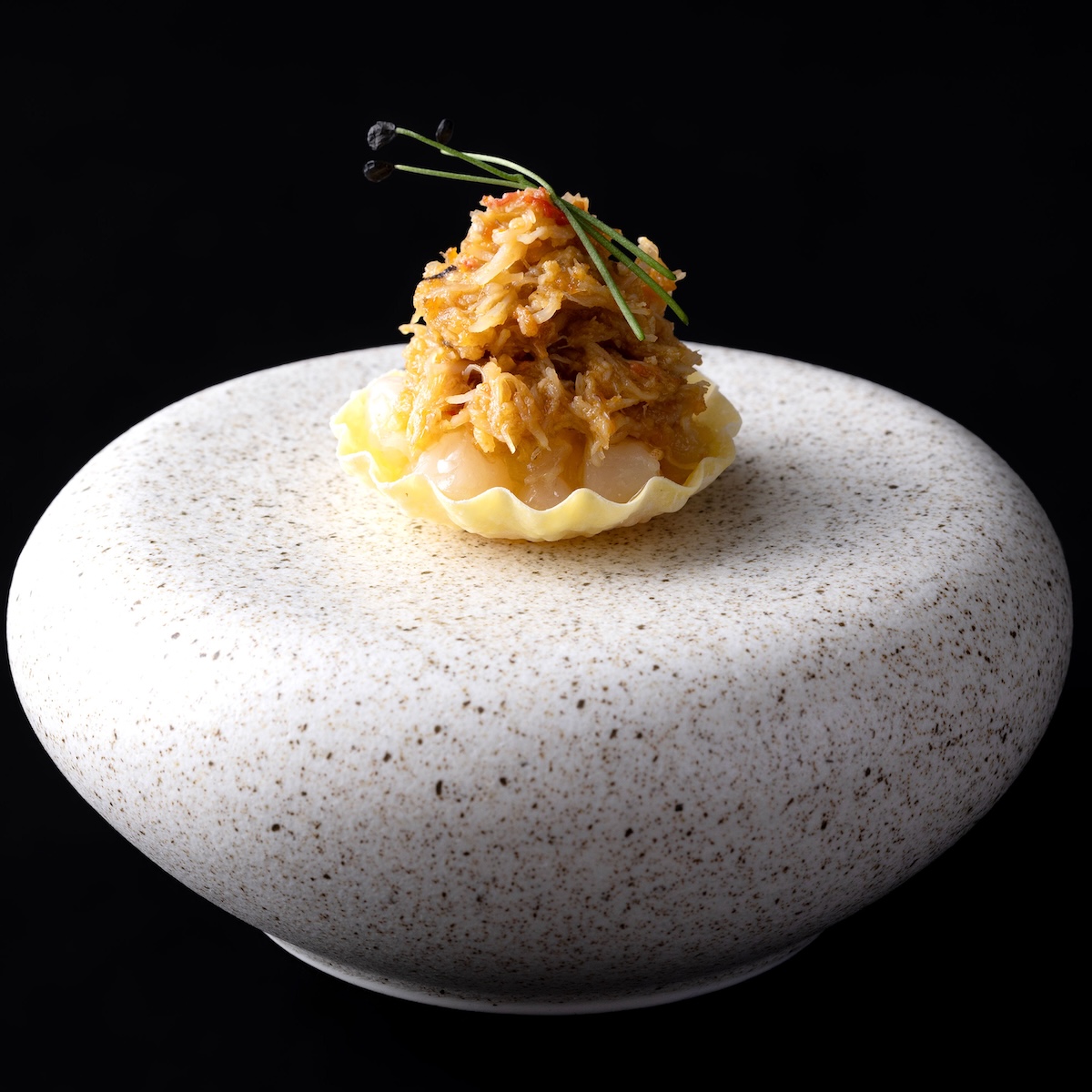 焼売の皮をオーブンでクリスピーに焼き上げ、帆立を生姜と葱の香りが豊かに広がる姜葱醬で和え、旬の上海蟹を重ねたアミューズ。帆立のやさしい甘みに、上海蟹の旨味が重なる、軽やかで香り高い一口となっています。