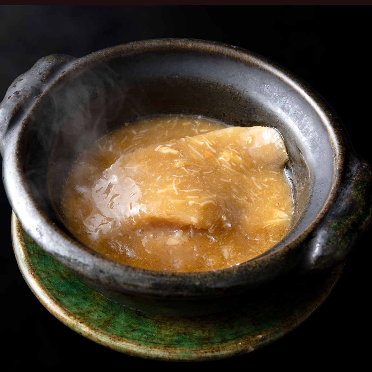 気仙沼産の吉切鮫の尾鰭を上海蟹の旨味を纏わせて煮込み、秋田県の新たな銘柄米「サキホコレ」と合わせた土鍋ご飯。一粒一粒がしっかりと主張しつつ、噛むほどに上品な甘みと粘りが広がるバランス感が最大の魅力です。