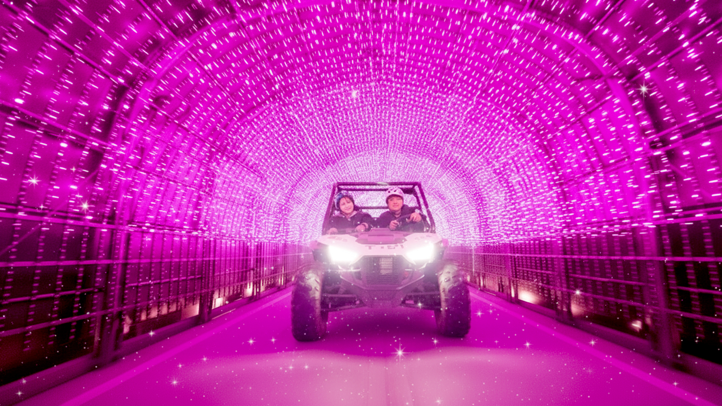 ホテルを出発すると、まず目の前に現れる光の演出エリア。色とりどりの輝きがトンネル状に連なる幻想的な空間を抜けます。冬の澄んだ空気の中、光や星空に包まれながらバギーで駆け抜ける非日常の冒険。光と自然が織りなす体験を、大切な人とご一緒にお楽しみください。