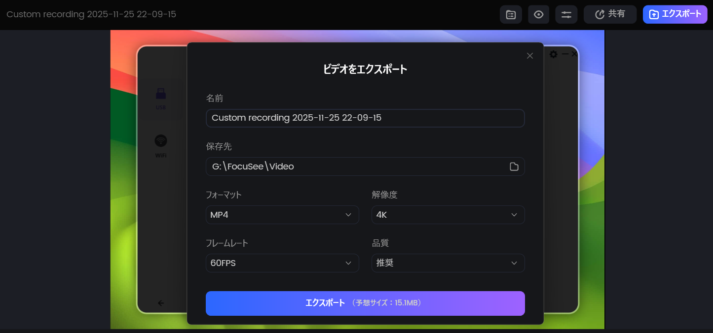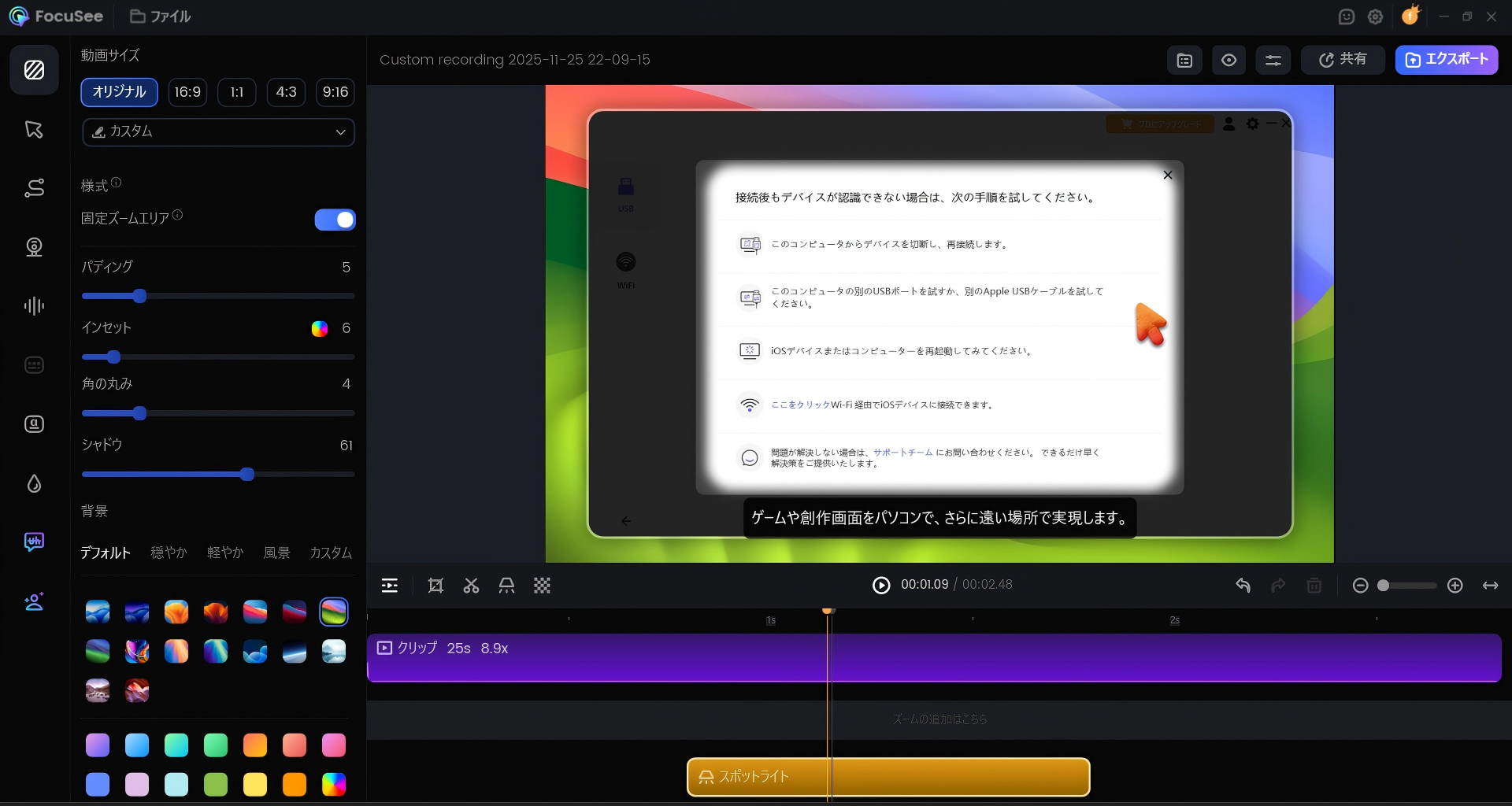 録画を終了すると、FocuSeeは自動的に動画を生成し、画面上の重要なインタラクションをハイライトするズームアニメーションを適用します。背景、カメラレイアウトの変更、動画のアスペクト比の調整により、さらにカスタマイズできます。