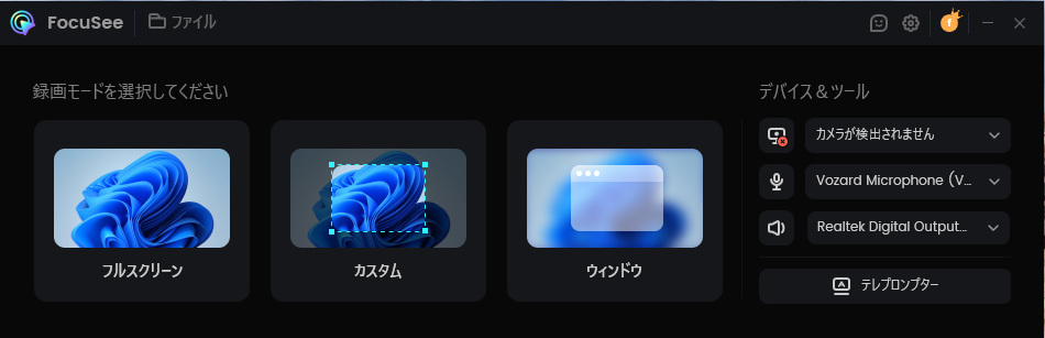 録画設定を行い、カメラとマイクを選択します。設定が完了したら、赤いRECボタンを押して開始します。オーディオとカメラが正常に動作しているか再確認してください。録画開始前に、FocuSeeは3秒のカウントダウンを提供するので、準備する時間があります。