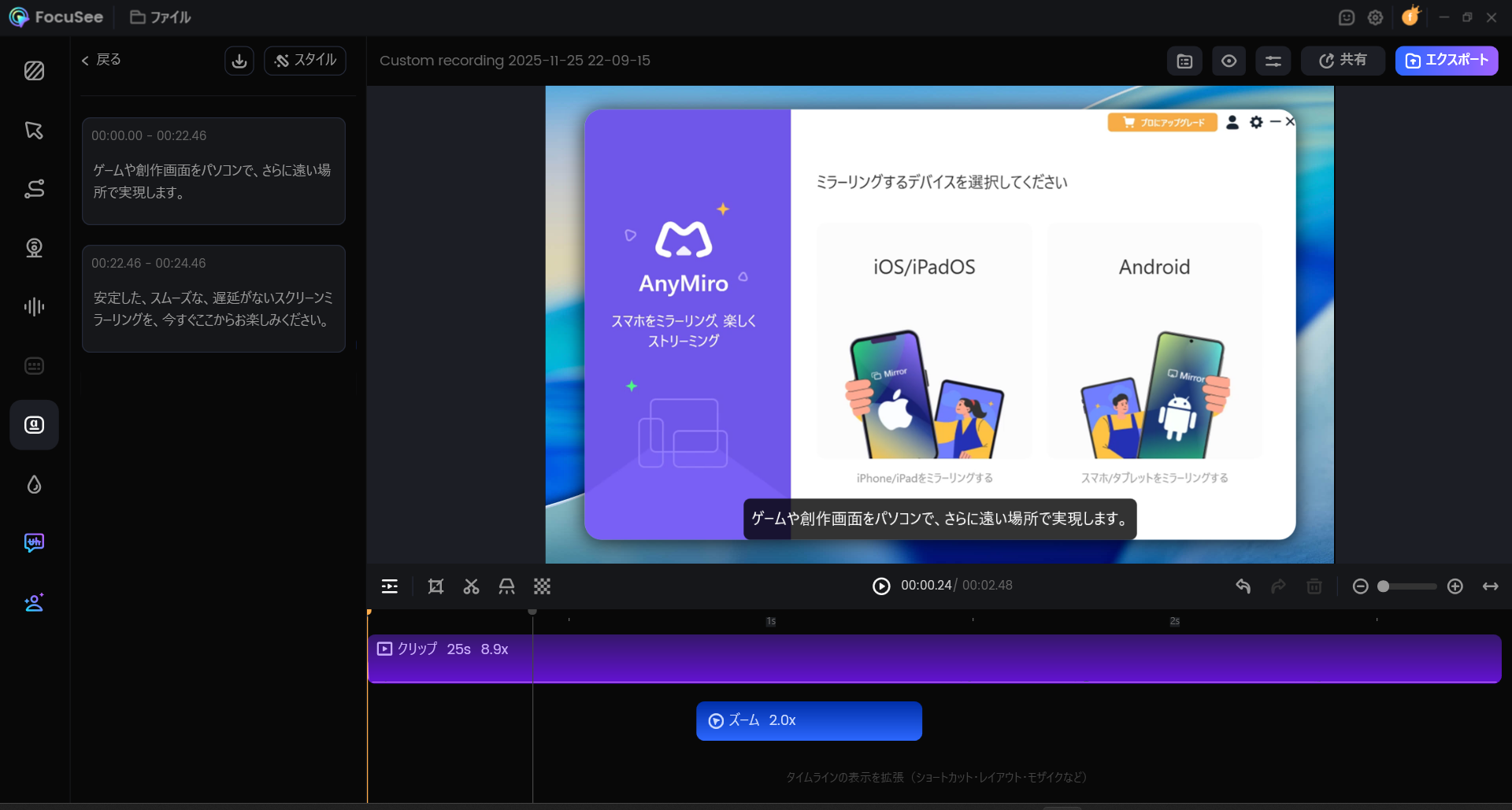 FocuSeeは、プロセスをより迅速かつストレスフリーにしたい場合に最適な選択肢です。シンプルなオートズーム、自動字幕機能により、プロフェッショナルで高品質な動画チュートリアル作成が可能になります。